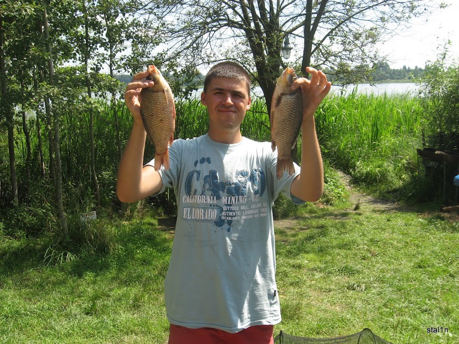 компанйони: Сергій Маліновський погода: жарка літня градусів 30-34, вітер східний ловив з 22.00 16.07.2010 до 14.00 17.07.2010 ловив на пірсі номер 14, Сергій на 8 я зловив 7 карасів(300-500 грам), одну плотву грам на 150, і 9 плотвиць на пальчик, загальна вага 3150 грам Сергій зловив в загальному 30 риб на 5 кілограм Наживка: кукурузка, опариш, мастирка, хробаки, горох Прикормка: власного виробництва Снасті: вудка, фідер, спініг на спутніку, спінінг з горохом в загальному по озері кльову не було На цих вихідних мав рибалити в Грушвиці, мене запросив знайомий, але чомусь у нього щось не склалось і в останній день перед рибалкою я був сильно накручений тому зателефонував свому другу Сергію з пропозицією десь порибалити. Таке враження, що він тільки ждав мого дзвінка і з радістю погодився 🙂 Прийняли рішення рибалити з ночівлею і податися на новий ставок, я запропонував Грем’яче. Коли ми туди прибули виявилось, що вночі ловити категорично заборонено. Пробували домовитись з хазяїном, але це вивився дуже специфічний чоловік, розмовляти з ним взагалі важко. Про що говориьт той факт, що на запитання: “як до Вас можна звертатись, яке Ваше ім’я?” він почав городити невідомо що 5 хвилин і імені так і не назвав. Застеріг: на донки ловити не можна, линка не брати, карпів до кілограма відпускати, ловити не більше як на три вудки, отут і отам нів’якому разі не сідати. У Грем’ячому(перше фото зліва) біля верб сидів рибалка, у активі якого з 11 ранку було аж 4 карасі кожен по 50 грам. Наспілкувавшсь з дивакуватим хазяїном і побачивши такий улов ми вирішили поїхати туди, де нам будуть раді і ніяких обмежень немає – в Бочаницю. Прибувши на місце мій напарник вирішив бути поближче до машини і сів на восьмому пірсі, а я пішов на 14. Охоронець Іван завіз дві мої оснастки з горохом на метрів 100 від берега човном і гарненько все там прикормив. Поки я розклав вудки і фідер стало геть темно.. Посидівши з півтори годинки над незворшуними снастями я зрозумів, що як завжди в Бочаниці кльову вночі не буде. Пішов до свого напарника і яке було моє здивувавння, коли він показав свій садок: в активі вже бовтались три карасика, на моїх очах ще були клювання. Ловив він на вудку, наживка – мастирка. Світив ліхтариком на поплавки, ще він закинув фідер, який мовчав… Я пішов спати в машину… На пірсі номер 7 відпочивали хлопці з дівчатами, пили горілку і купались, робили багато шуму. Як потім розповідва напарник – займались коханням прямо на пірсі 🙂 дівчата ахкали на весь острів Зранку ще коли було темно я пішов на своє місце, все ще раз прикормив і почав чекати. Почало світати, дивлюсь, а на моєму спінінгу(той, що завіз на човні Іван) немає нятг лески, я почав ігом витягувати, риба пішла в берег і сторону. Витягував леску катушкою типу “Невська” хвилин три аж поки відчув – риба є! Це виявився карась на 550 грам. Після цього зловив ще одного карасика на кукурузку і все заглохло Мої сусіди на 15 і 16 пірсах теж не бачили покльовок і змотались додому о восьмій ранку. О годині девятій почала клюювати ипленька плотва на фідер. Від скуки закинув два спутніка з мастиркою, як виявилось безтолку. Іноді клювало на вудки на кукурузку, але в більшості випадків риба умудрялась запутувати снасті в камишах, тому довелось разів з п’ять лазити у воду. Це було спасінням в таку спеку. Почав експеремнтувати з наживкою і це дало результат: хробак+