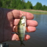 Ищу окуня и не могу найти, меняю приманки… Наконец возле камыша еле заметный тук на нарезь с Юмовской съедобки, потом второй тук. Потом упорного выдрачивания наконец ловлю микро окушка – так дело не пойдёт... Беру другой спин, на котором со вчерашнего дня стоит бомбарда и решаю парой забросов проверить краснопёрку и тут понеслось – поклёвки на каждом забросе.