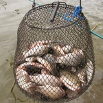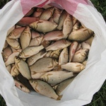 Фото мого улову (у пакеті) і улову мого друга (в садку) після ранішнього кльову до обіднього затишшя: