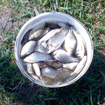 Сначала пробовал на опарыша, но вскоре выяснилось, что наиболе активный клёв сегодня на растительные насадки - перловку, и особенно мастырку. Так что впоследствии я ловил именно на мастырку. Помимо стандартных ладошечных карасиков мной были пойманы несколько махоньких карпиков и малюсенький белый амур (видимо из тех, которыми зарыбляли водоём этой весной), естественно отпущены. Также попался один довольно крупный карась 250-300 грамм. Всё поймано на одну поплавочную удочку, даже если бы была вторая - не было никакого смысла её забрасывать.
