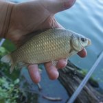 ) дві точки лову (одна в самому березі, інша на викиді) і закинув снасті. В якості наживки використовував мастирку і червоного хробака. Першу покльовку довелося чекати доволі довго. Добре, що вибране мною місце було в тіні, тому сонце не дошкуляло, на відміну від бокового вітру. Ловити двограмовим і однограмовим полплавцями було трохи не комфортно, але важчих з собою не мав. Врешті-решт, один із поплавців пішов під воду і в мене в руках опинилася невелика плотвичка. Невдовзі знову хтось поцікавився наживкою. Як виявилось це був пристойний рак.В подальшому ще одного впіймав.