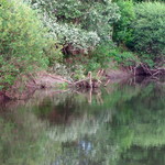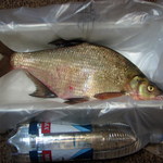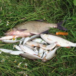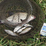 Где-то часа через два с половиной приехал. А через часик после звонка начала клевать только мелкая верховодка. Блин! Зубы у нее что-ли алмазные! Клюет, не дает подойти ничему крупному, а вытащить не получается... Одно расстройство. Пришлось сменить место. Опять ушел под наклоненное дерево. Так к вечеру у меня в садке оказался полуторакилограммовый лещ, неплохой голавлик и еще какая-то мелочь.